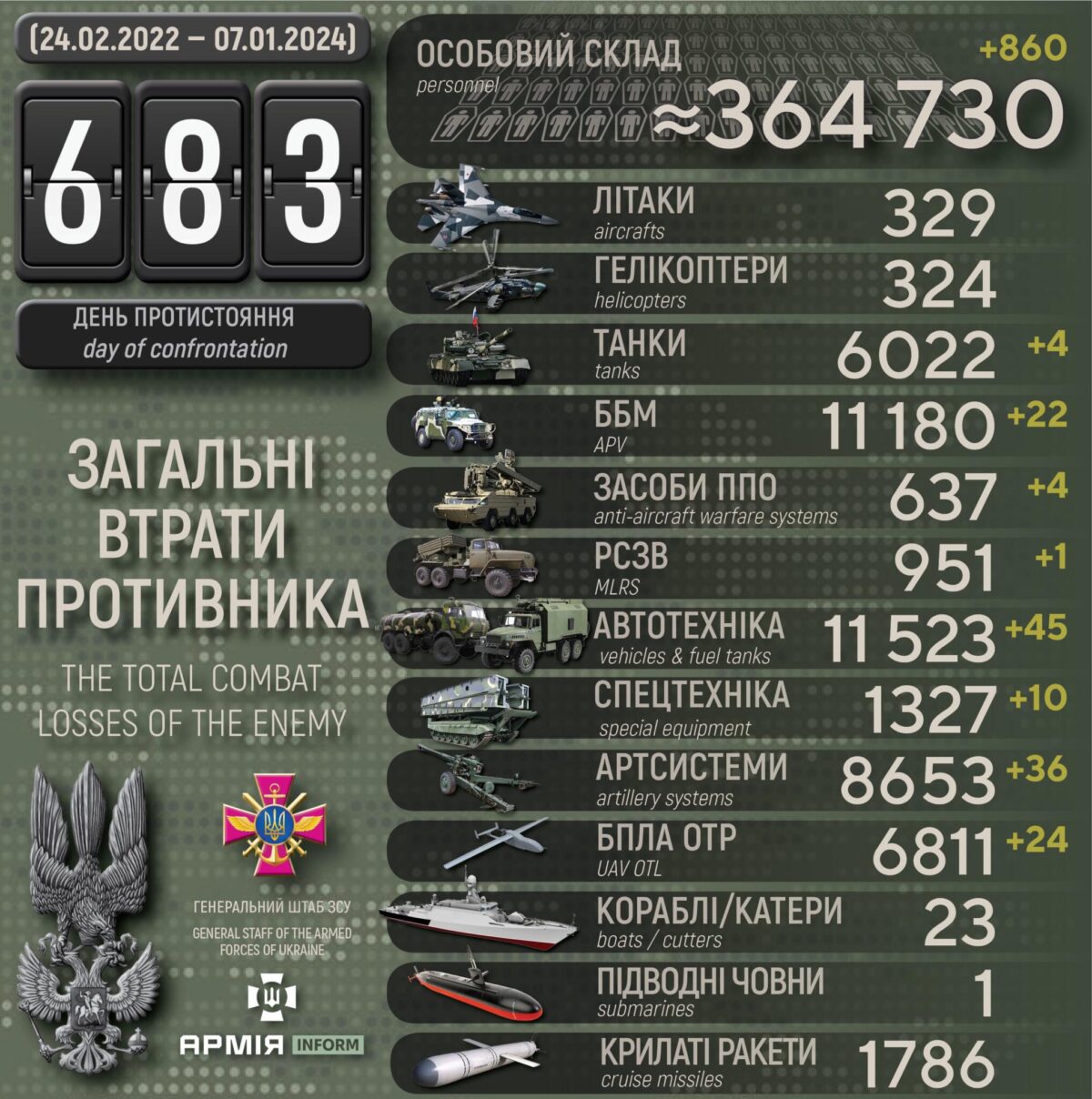 Загальні бойові втрати противника з 24.02.22 по 07.01.24 орієнтовно становлять:
