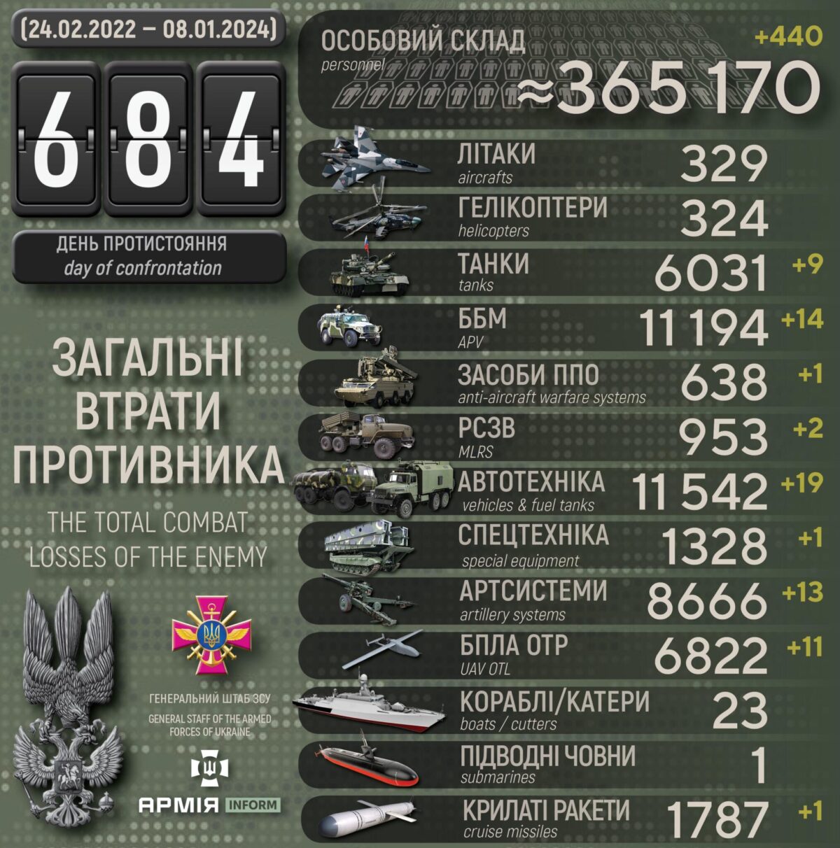 Загальні бойові втрати противника з 24.02.22 по 08.01.24 орієнтовно становлять: