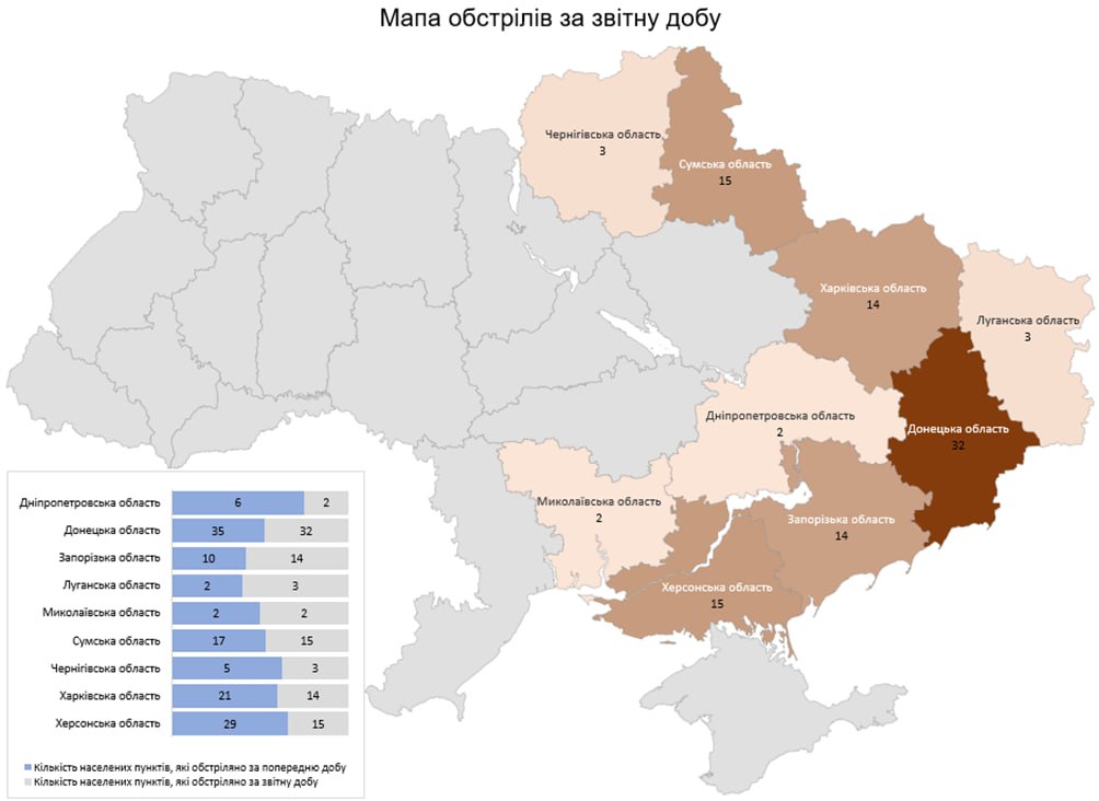 «Загалом з різних видів озброєння — міномети, танки, ствольна артилерія, РСЗВ, ЗРК, ОТРК, БПЛА та тактична авіація — були атаковані 100 населених пунктів та 23 об’єкти інфраструктури», — йдеться в повідомленні.