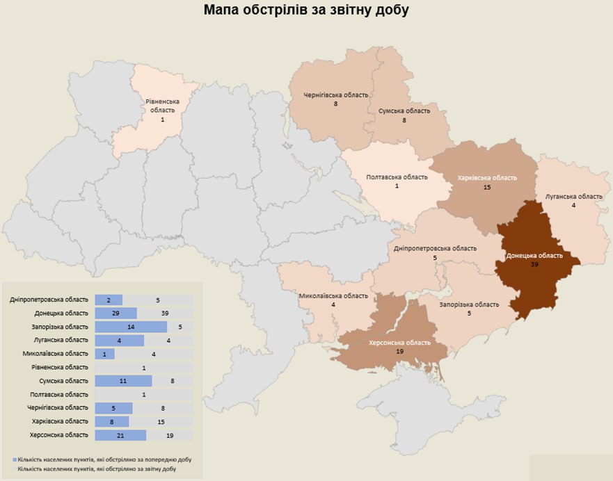 «Загалом з різних видів озброєння — міномети, танки, ствольна артилерія, РСЗВ, ЗРК, ОТРК, БПЛА та тактична авіація — були атаковані 109 населених пунктів та 88 об’єктів інфраструктури», — йдеться у повідомленні.