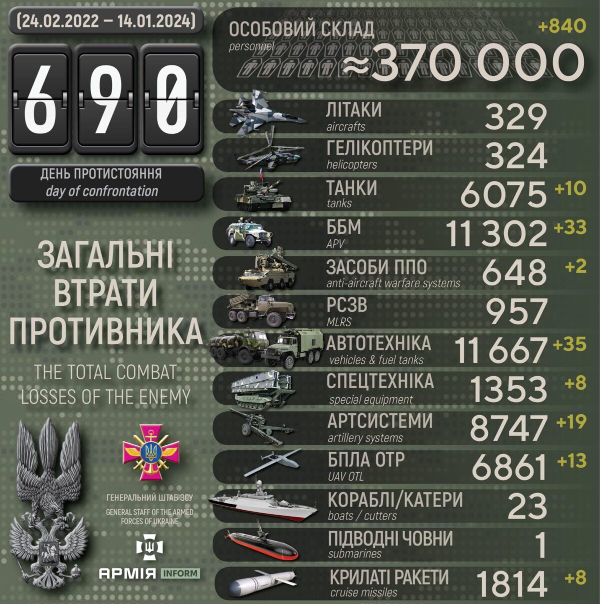 Загальні бойові втрати противника з 24.02.22 по 14.01.24 орієнтовно становлять: