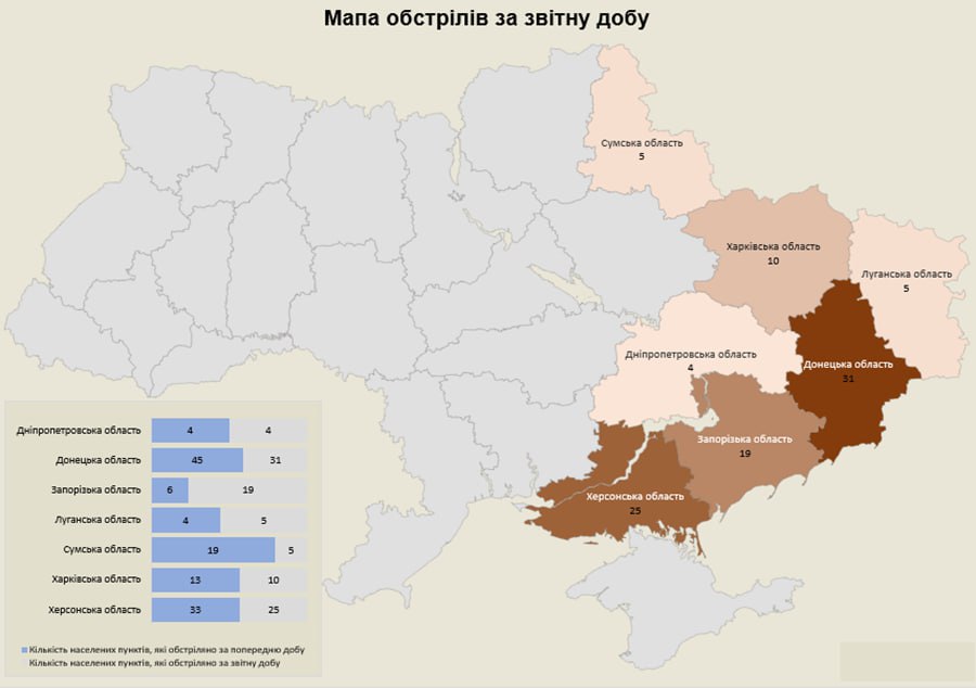 «Загалом з різних видів озброєння — міномети, танки, ствольна артилерія, РСЗВ, ЗРК, ОТРК, БПЛА та тактична авіація — були атаковані 99 населених пунктів та 80 об’єктів інфраструктури», — йдеться в повідомленні.