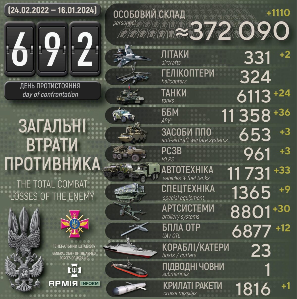 Загальні бойові втрати противника з 24.02.22 по 16.01.24 орієнтовно становлять: