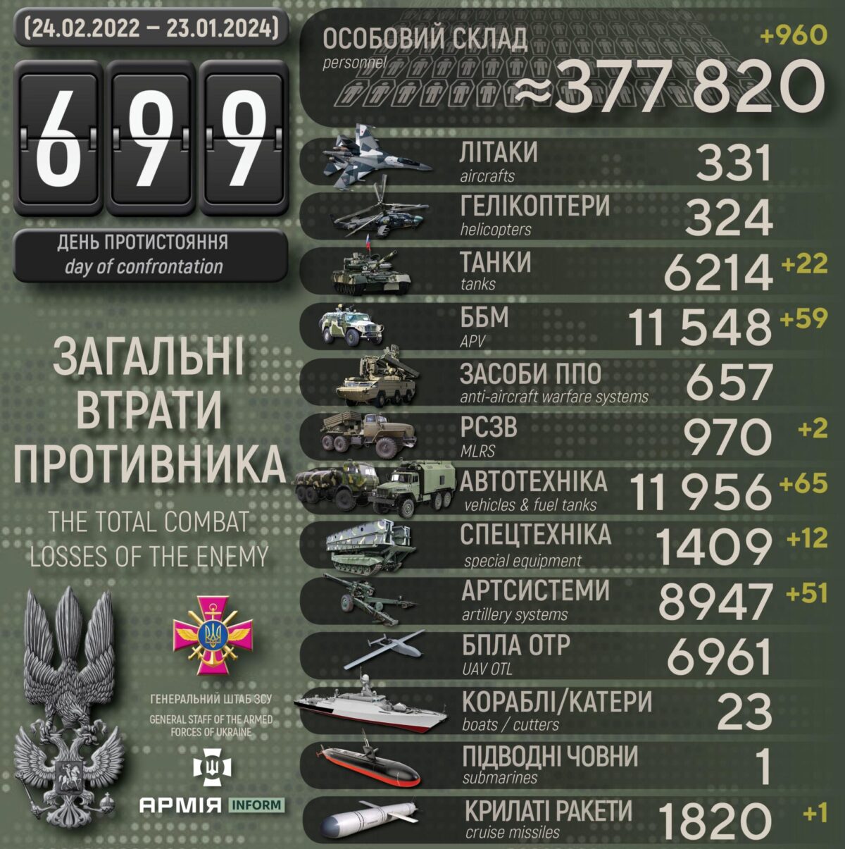 Загальні бойові втрати противника з 24.02.22 по 23.01.24 орієнтовно становлять: