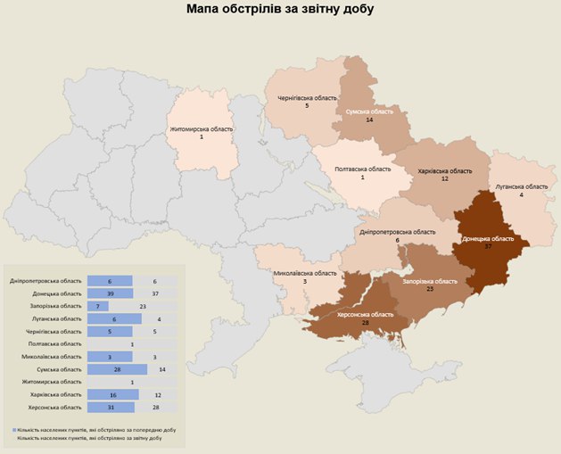 «Загалом з різних видів озброєння — міномети, артилерія, танки, РСЗВ, ЗРК, БПЛА та тактична авіація — були атаковані 134 населених пунктів та 113 об’єктів інфраструктури», — йдеться в повідомленні.