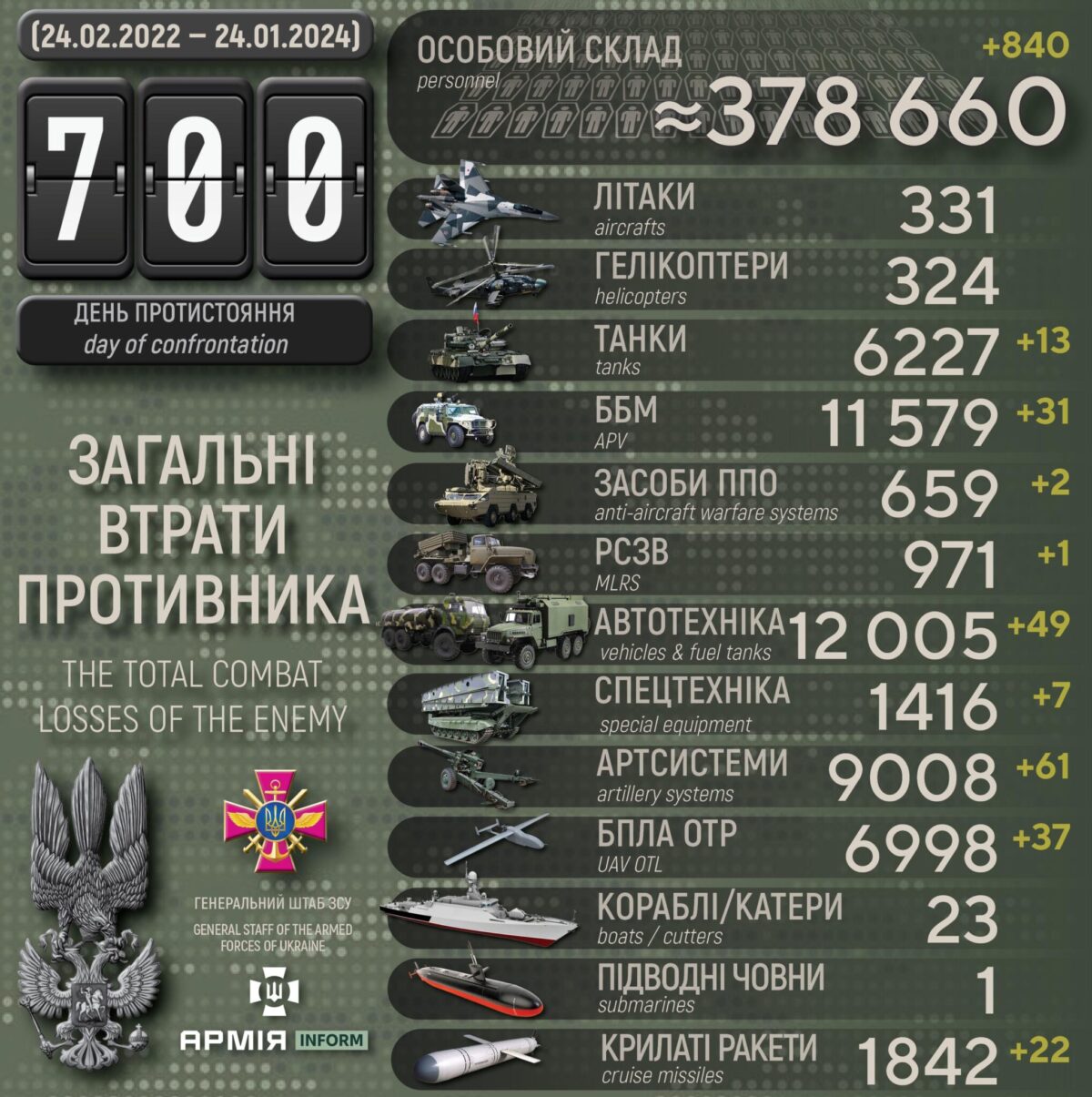 Загальні бойові втрати противника з 24.02.22 по 24.01.24 орієнтовно становлять: