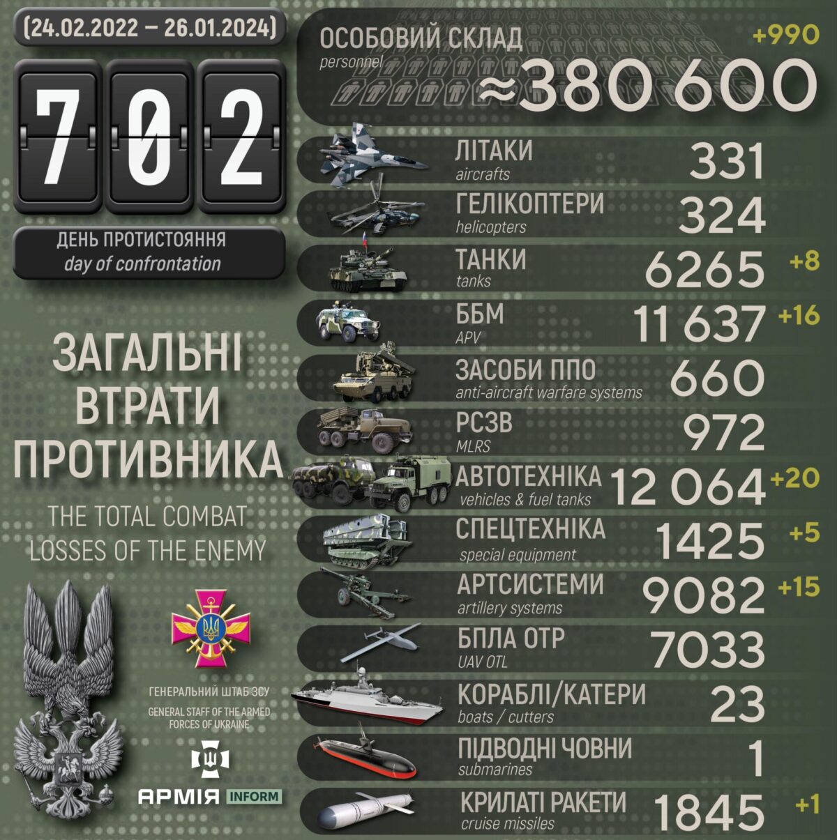 Джерело: Генеральний штаб Збройних Сил України станом на 26.01.24.