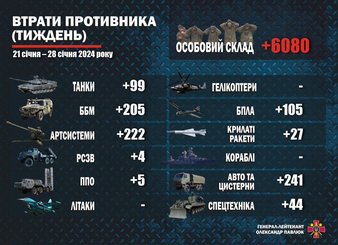 За тиждень із 21 по 28 січня 2024 року Сили оборони України ліквідували 6080 одиниць особового складу російських терористів. Зокрема знищили 99 танків й не тільки.