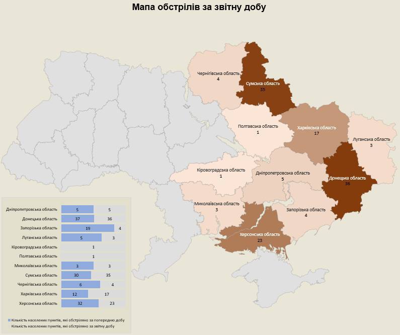 «Загалом з різних видів озброєння — міномети, артилерія, танки, РСЗВ, ЗРК, БПЛА та тактична авіація — були атаковані 132 населені пункти та 199 об’єктів інфраструктури», — йдеться в повідомленні.
