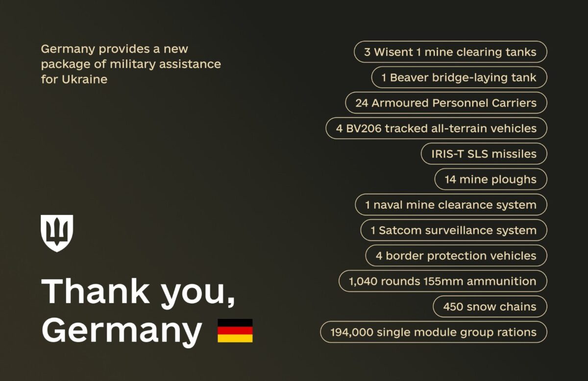 «Німеччина надала Україні новий пакет військової допомоги, до якого входять бронетехніка, міночисне обладнання, 155-мм боєприпаси та інше необхідне спорядження для наших захисників.