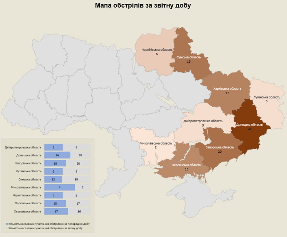 «Загалом з різних видів озброєння — міномети, артилерія, танки, РСЗВ, ЗРК, БПЛА та тактична авіація — були атаковані 114 населених пунктів та 44 об’єкти інфраструктури», — йдеться в повідомленні.
