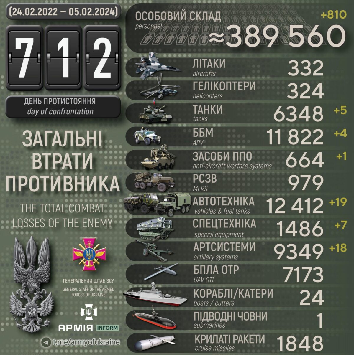 Джерело: Генеральний штаб Збройних Сил України станом на 05.02.24.