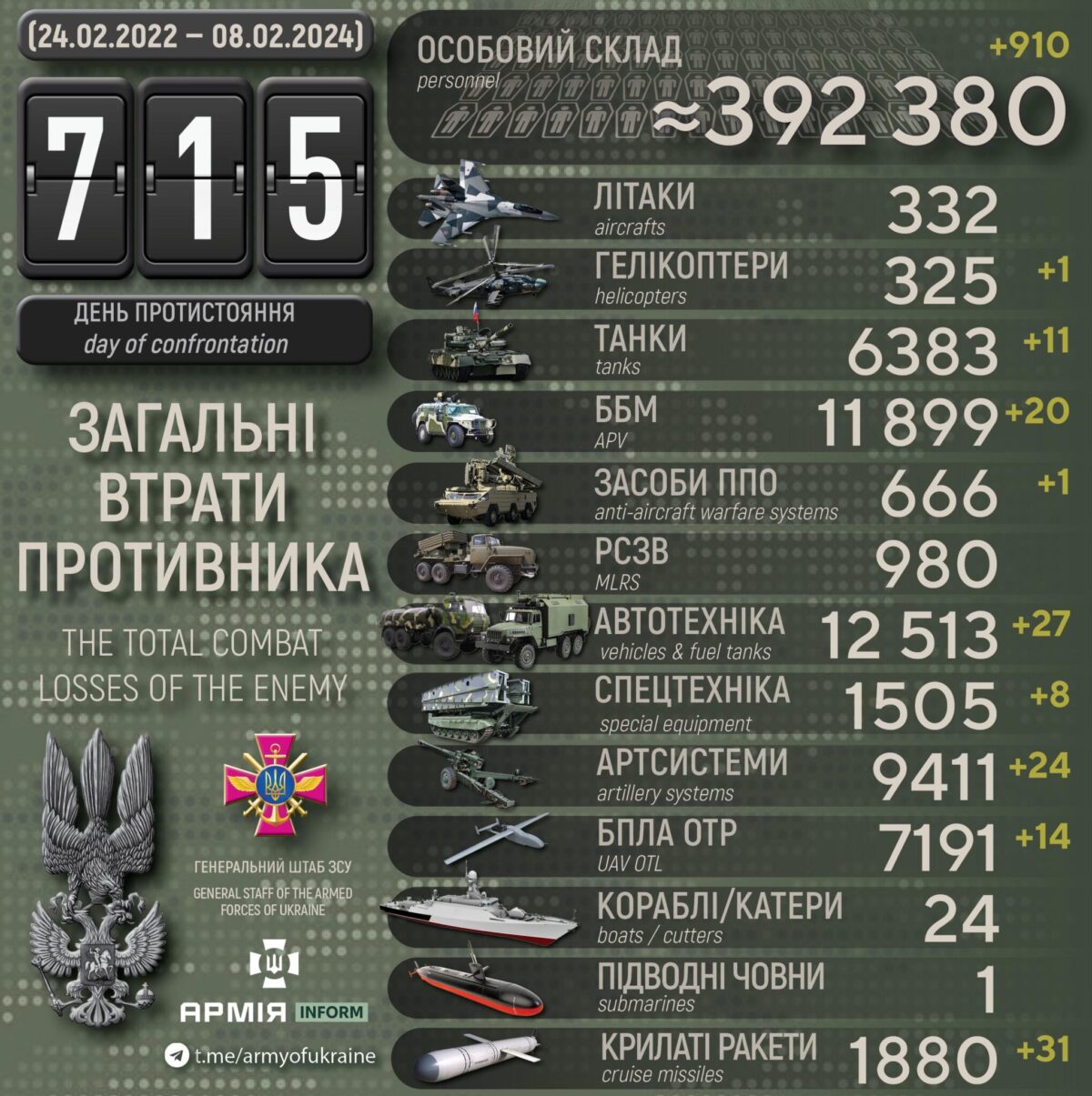 Загальні бойові втрати противника з 24.02.22 по 08.02.24 орієнтовно становлять: