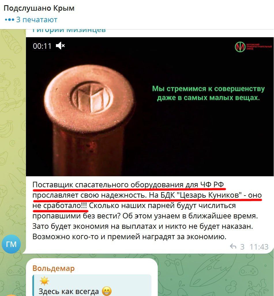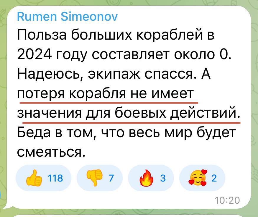 Крім цього, на просторах ворожих пабліків та рашистських ЗМІ, багато окупантів почали скиглити, що кораблі їхнього флоту досі не мають ніяких засобів для протидії загрозам, тому їх «расстреливают как куропаток».