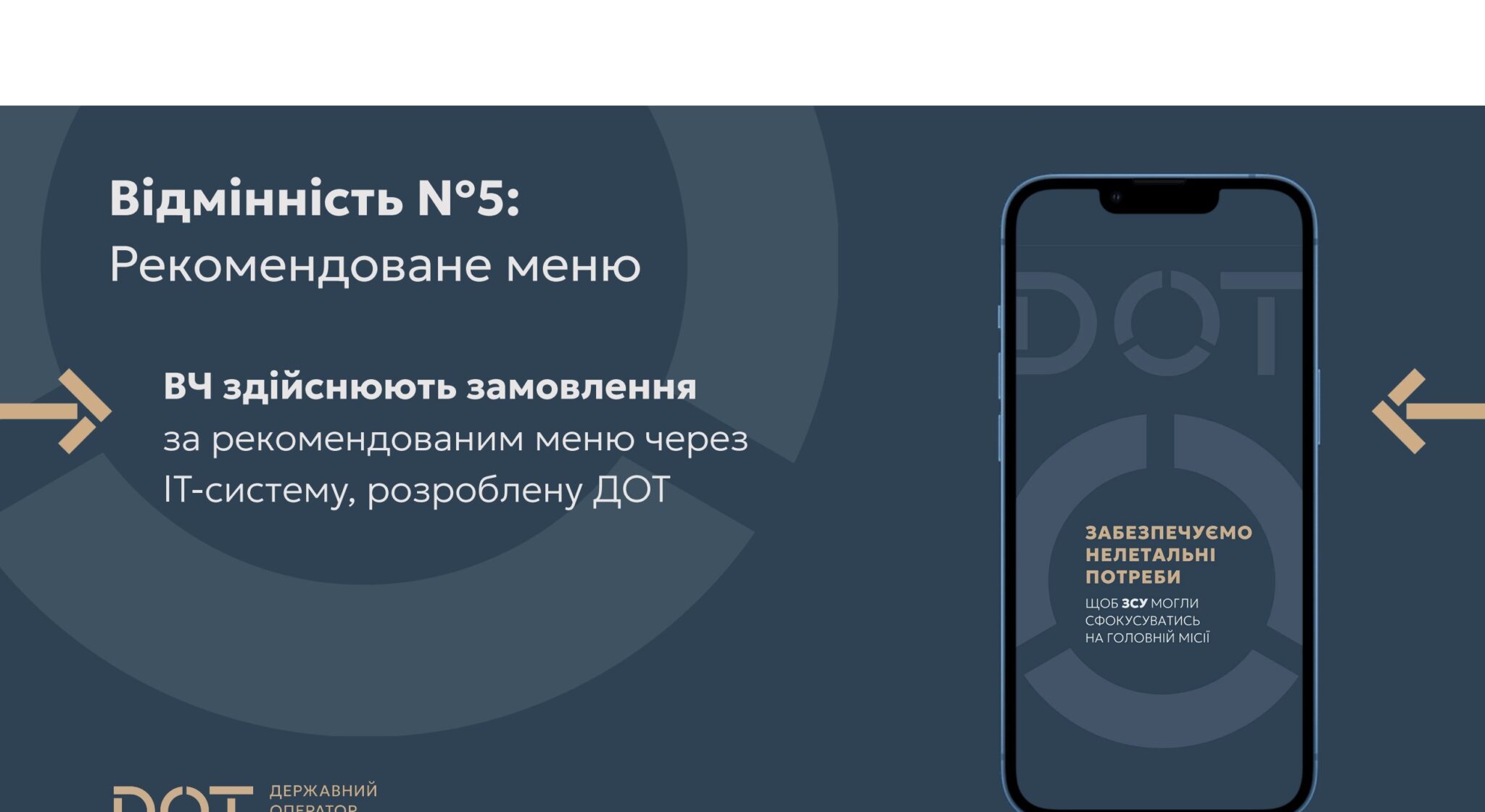 Наразі команда DOT разом з експертами та Міністерством оборони України розробляє меню та технологічні карти, за якими начпроди зможуть здійснювати замовлення продуктів харчування для Збройних Сил України.