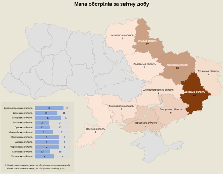 Війська росармії атакували майже сотню населених пунктів та 89 об’єктів інфраструктури з різних видів озброєння. Зокрема, з мінометів, танків, ствольної артилерії, РСЗВ, БПЛА, ОТРК, ЗРК та тактичної авіації.