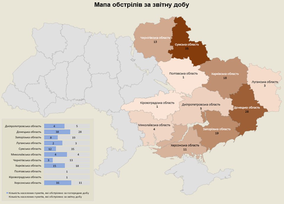 «Загалом з різних видів озброєння — міномети, танки, ствольна артилерія, РСЗВ, ЗРК, ОТРК, БПЛА та тактична авіація — були атаковані 138 населених пунктів та 114 об’єктів інфраструктури», — йдеться в повідомленні.