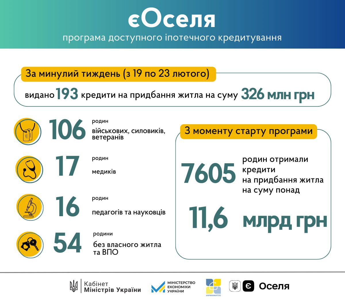 Вже 7605 родин отримали кредити на суму майже 11,6 млрд грн у межах урядової програми єОселя з моменту її старту.