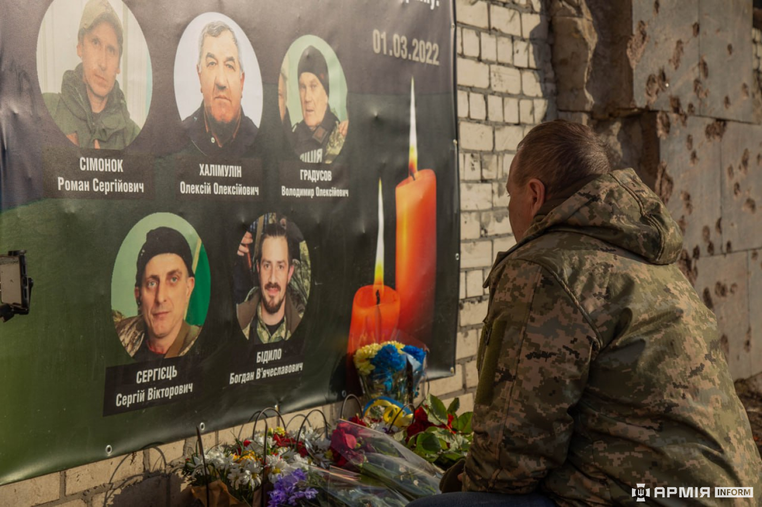 На колінах біля портретів загиблих тероборонівців стоїть чоловік та вглядається в рідне обличчя. Під завалами 1 березня 2022 року обірвалося життя його сина Бідило Богдана.