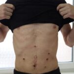 На тілі ледь помітні невеликі розрізи від доступів лапароскопічних інструментів.