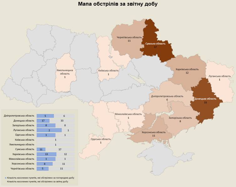 «Загалом з різних видів озброєння — мінометів, артилерії, танків, РСЗВ, ЗРК, ОТРК, КРМБ, БПЛА, стратегічної та тактичної авіації — були атаковані 123 населених пунктів та 244 об’єктів інфраструктури», — йдеться в повідомленні.