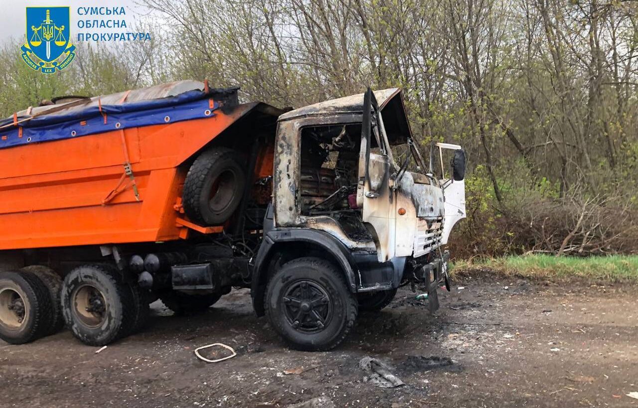14 квітня близько 8:00 окупанти на території Краснопільської громади Сумського району окупанти скинули з дрона вибухівку на вантажівку.