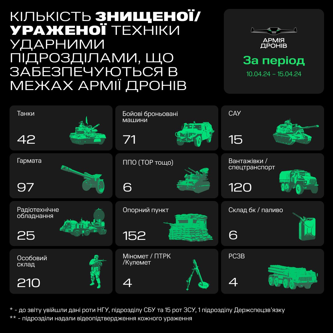 Стільки ворожої техніки знищили з 10 по 15 квітня ударні підрозділи, що забезпечуються Армією дронів.