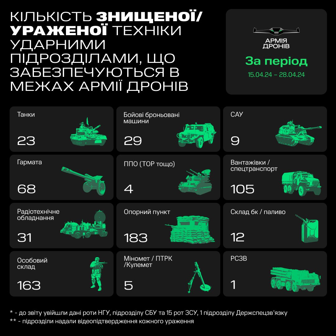 Тільки за останні два тижні ударні підрозділи, які забезпечуються Армією дронів, вразили 183 опорні пункти ворога, 23 танки і 9 самохідок.