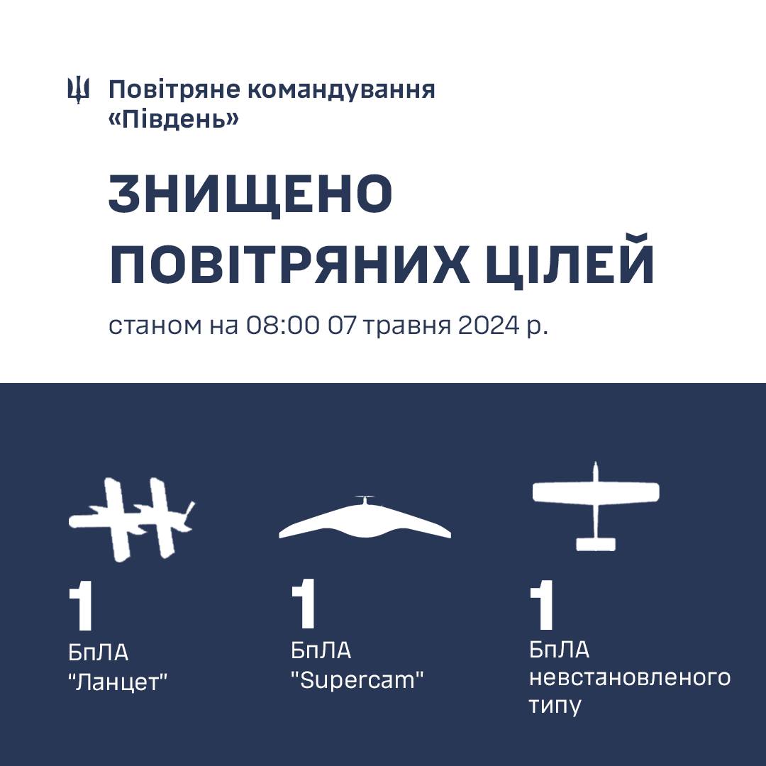 Зокрема, упродовж минулої доби, 6 травня 2024 року, підрозділи протиповітряної оборони півдня України знищили: ударний «Ланцет» на Миколаївщині, розвідувальний Supercam та безпілотник невстановленого типу на Херсонщині.
