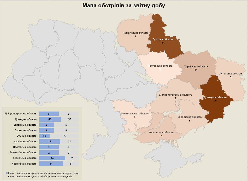 Загалом з різних видів озброєння — мінометів, артилерії, танків, РСЗВ, ЗРК, БПЛА, тактичної авіації — були атаковані 116 населених пунктів та 70 об’єктів інфраструктури.