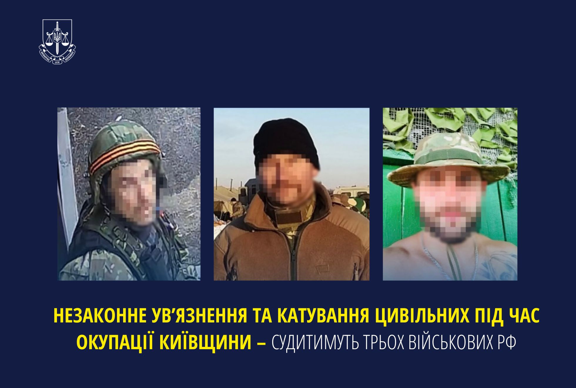 До суду скерований обвинувальний акт стосовно трьох військових рф за фактом порушення законів та звичаїв війни: незаконного ув’язнення та катування цивільних під час окупації Київщини.