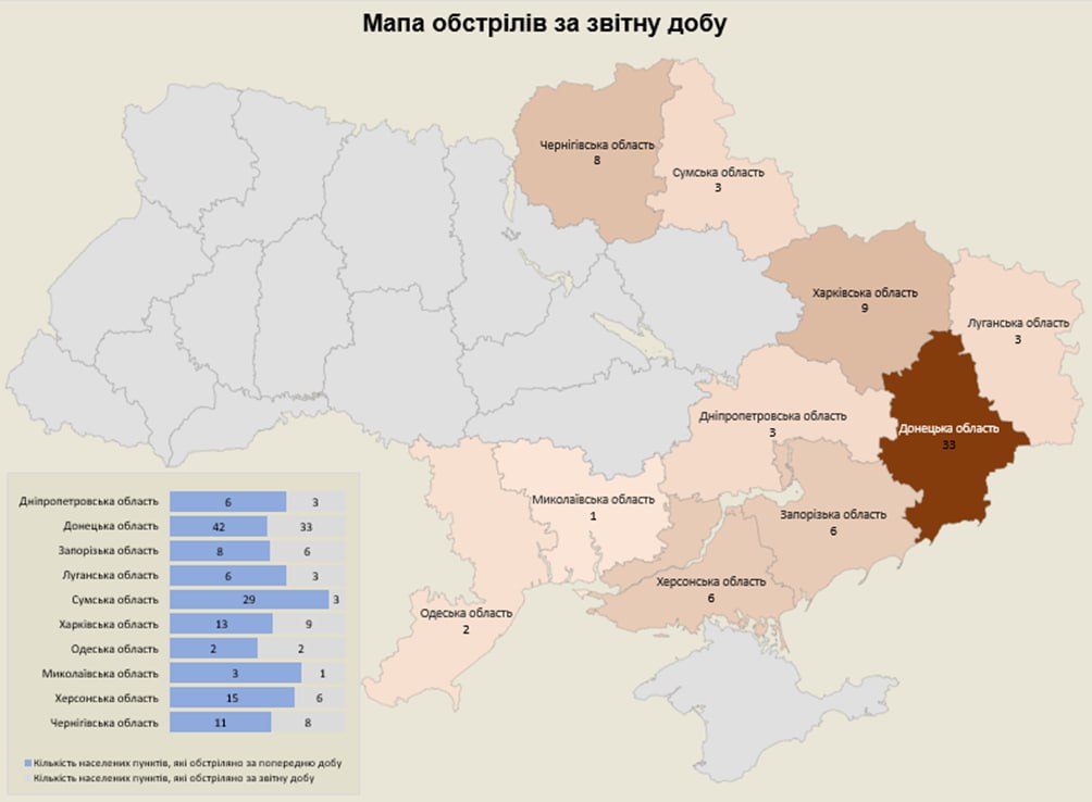Загалом з різних видів озброєння — мінометів, артилерії, танків, РСЗВ, ЗРК, БПЛА, тактичної авіації — були атаковані 74 населені пункти та 135 об’єктів інфраструктури.