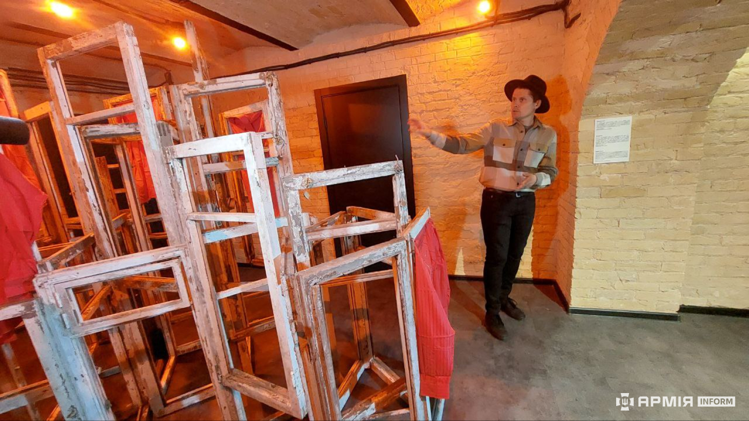 «Це пам’ятник, монумент, створений з віконних рам і вмурований в підвал, нагадує тюрму», — розповів про роботу митець.