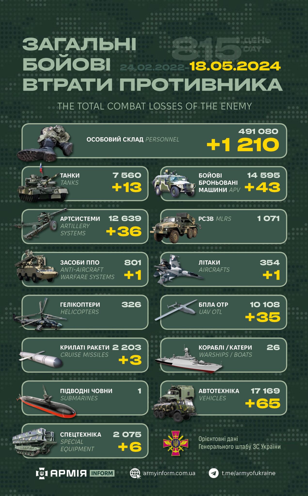 Генеральний штаб ЗС України оприлюднив загальні бойові втрати російських окупантів з 24.02.22 по 18.05.24.