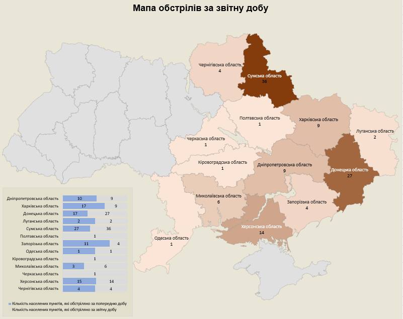 Загалом з різних видів озброєння — мінометів, артилерії, танків, РСЗВ, ЗРК, БПЛА, тактичної авіації — були атаковані 115 населених пунктів та 150 об’єктів інфраструктури.