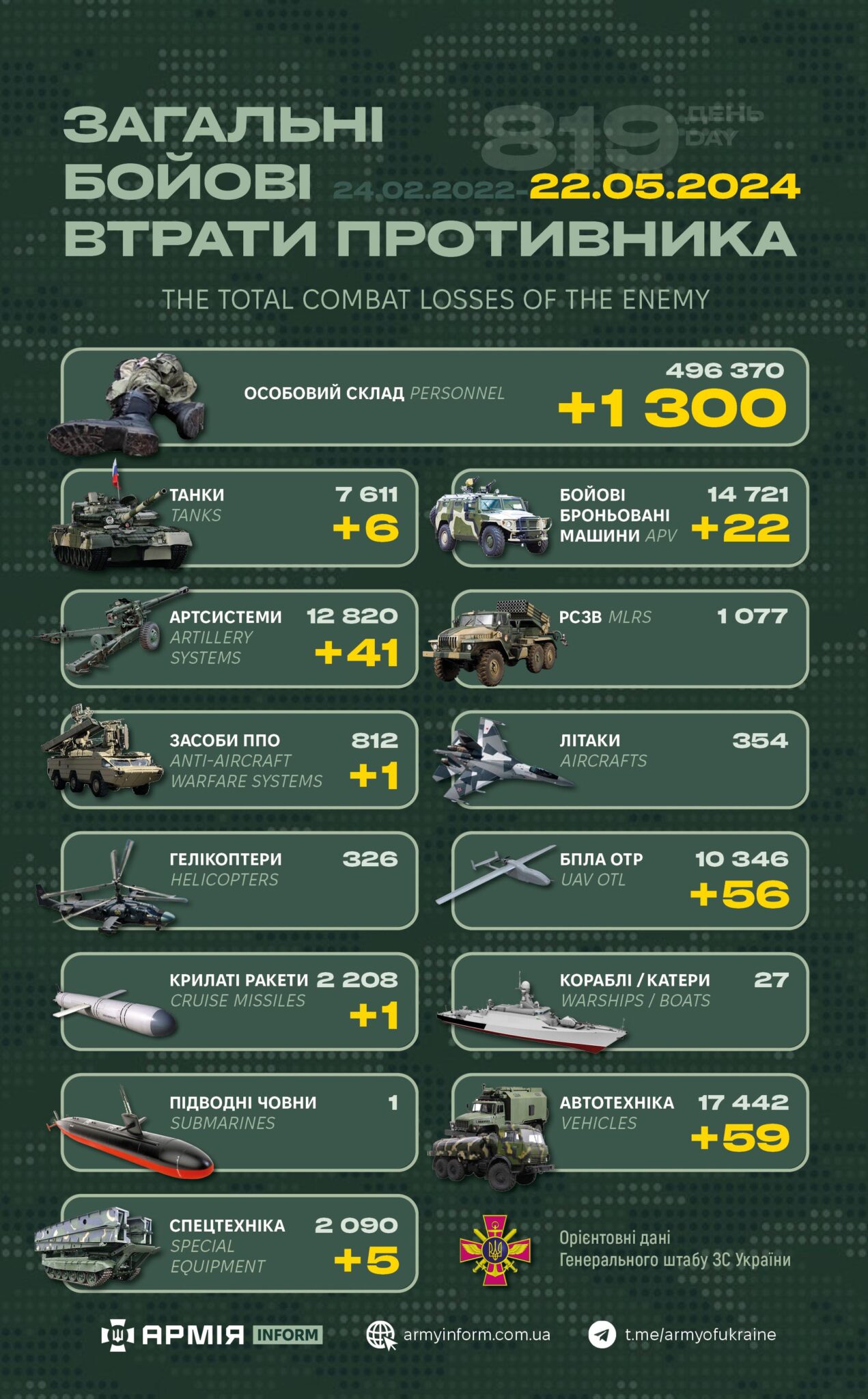 Генеральний штаб ЗСУ оприлюднив загальні бойові втрати противника з 24.02.22 по 22.05.24.
