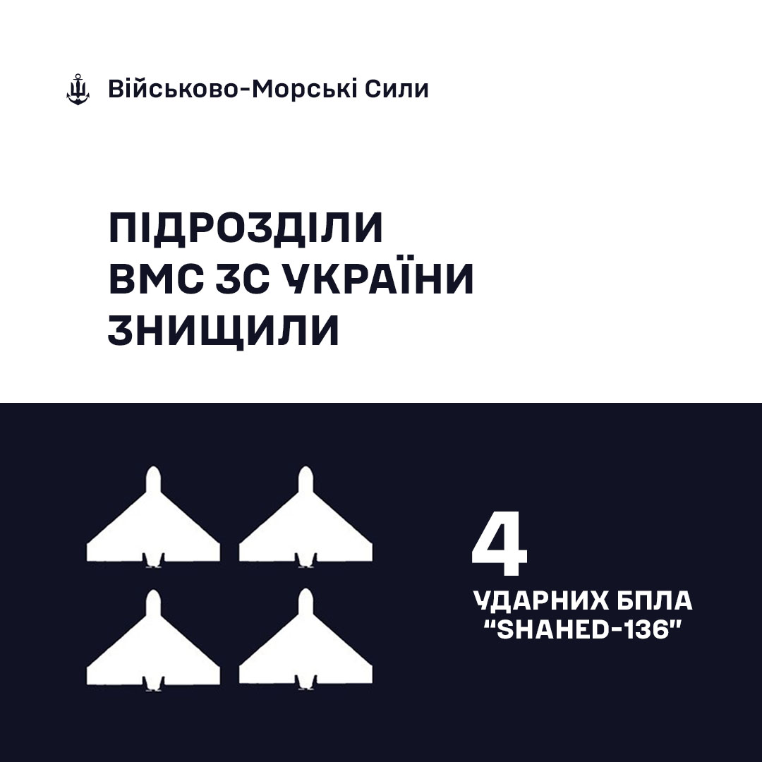Військово-Морські Сили Збройних Сил України знищили в ніч з 21 на 22 травня чотири ударні БПЛА Shahed.
