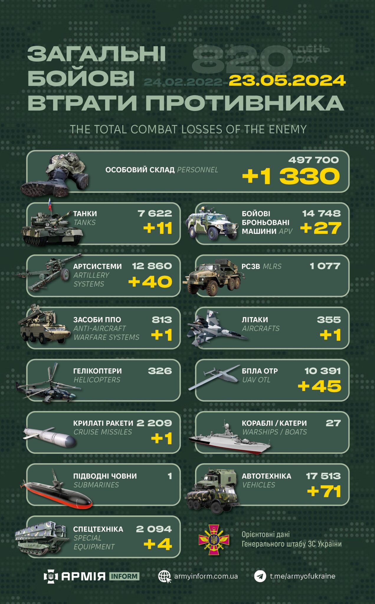 Генеральний штаб ЗСУ оприлюднив загальні бойові втрати противника з 24.02.22 по 23.05.24.