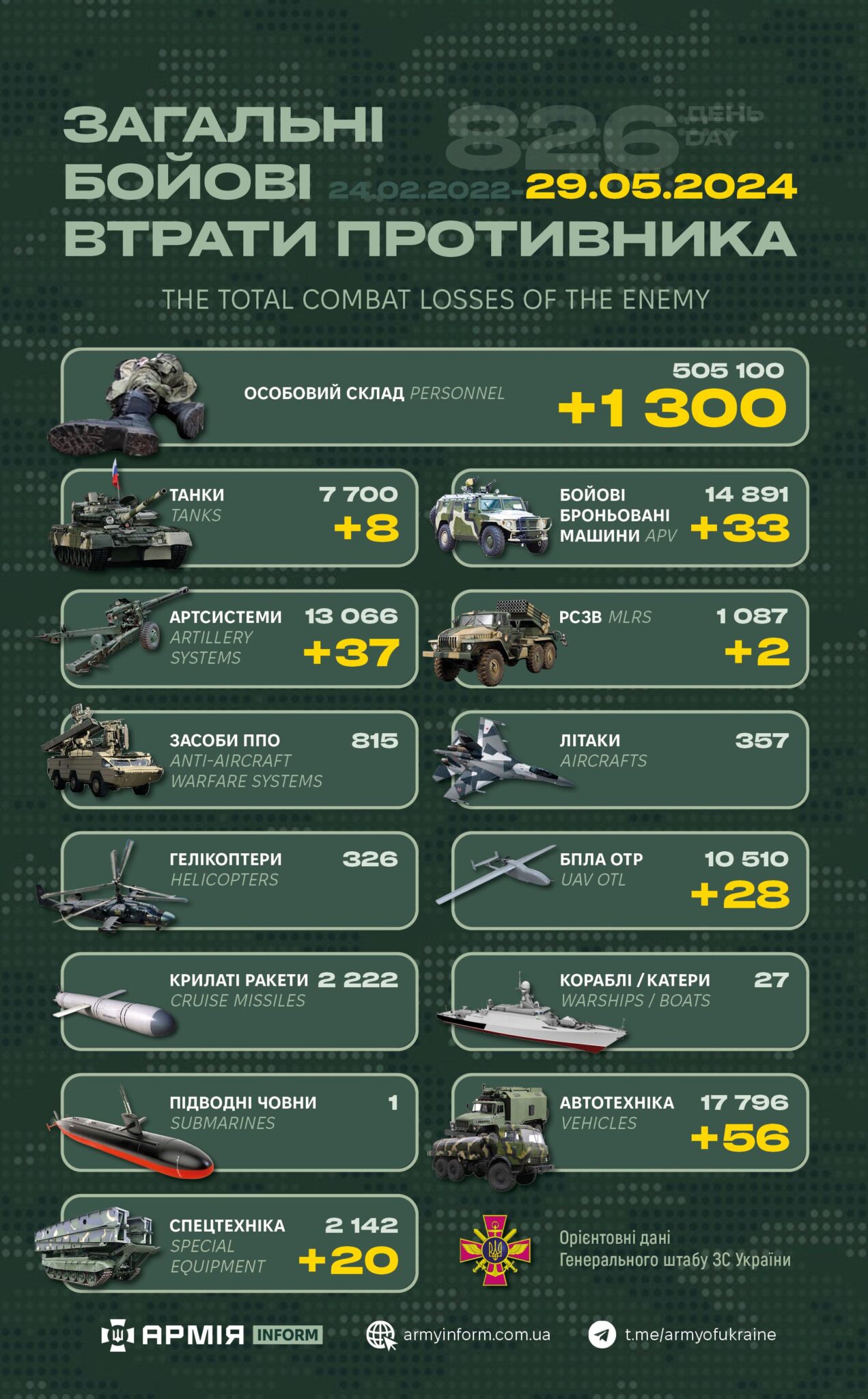 Генеральний штаб Збройних Сил України оприлюднив загальні бойові втрати противника з 24.02.22 по 29.05.24.