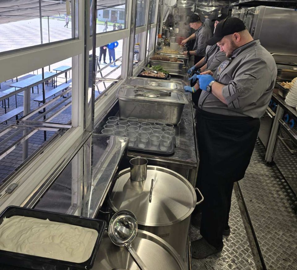 Змонтована кухня на базі тривісного напівпричепа. Дає змогу забезпечити триразове харчування для підрозділу. В її приміщенні, зокрема, є морозильна і холодильна камери, побутовий холодильник, кондиціонер, пароконвектомати та плити з духовками.