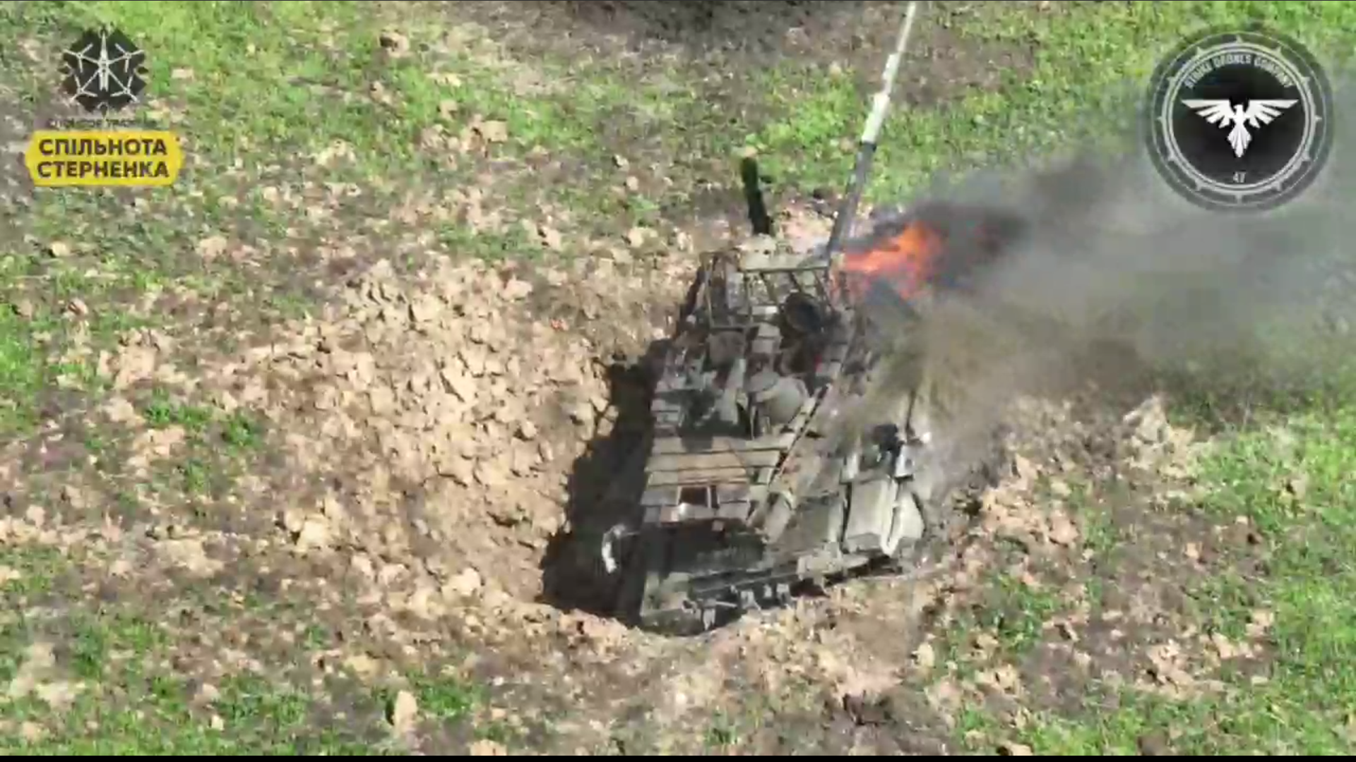російський танк заїхав у вирву від керованої авіаційної бомби та не зміг виїхати.