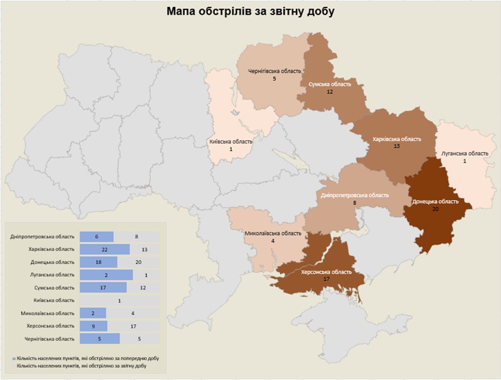 Загалом, обстрілювали із застосуванням різних видів озброєння: мінометів, артилерії, танків, РСЗВ, ЗРК, ОТРК, БПЛА, тактичної авіації. Атаковано 81 населений пункт та 181 об’єкт інфраструктури.