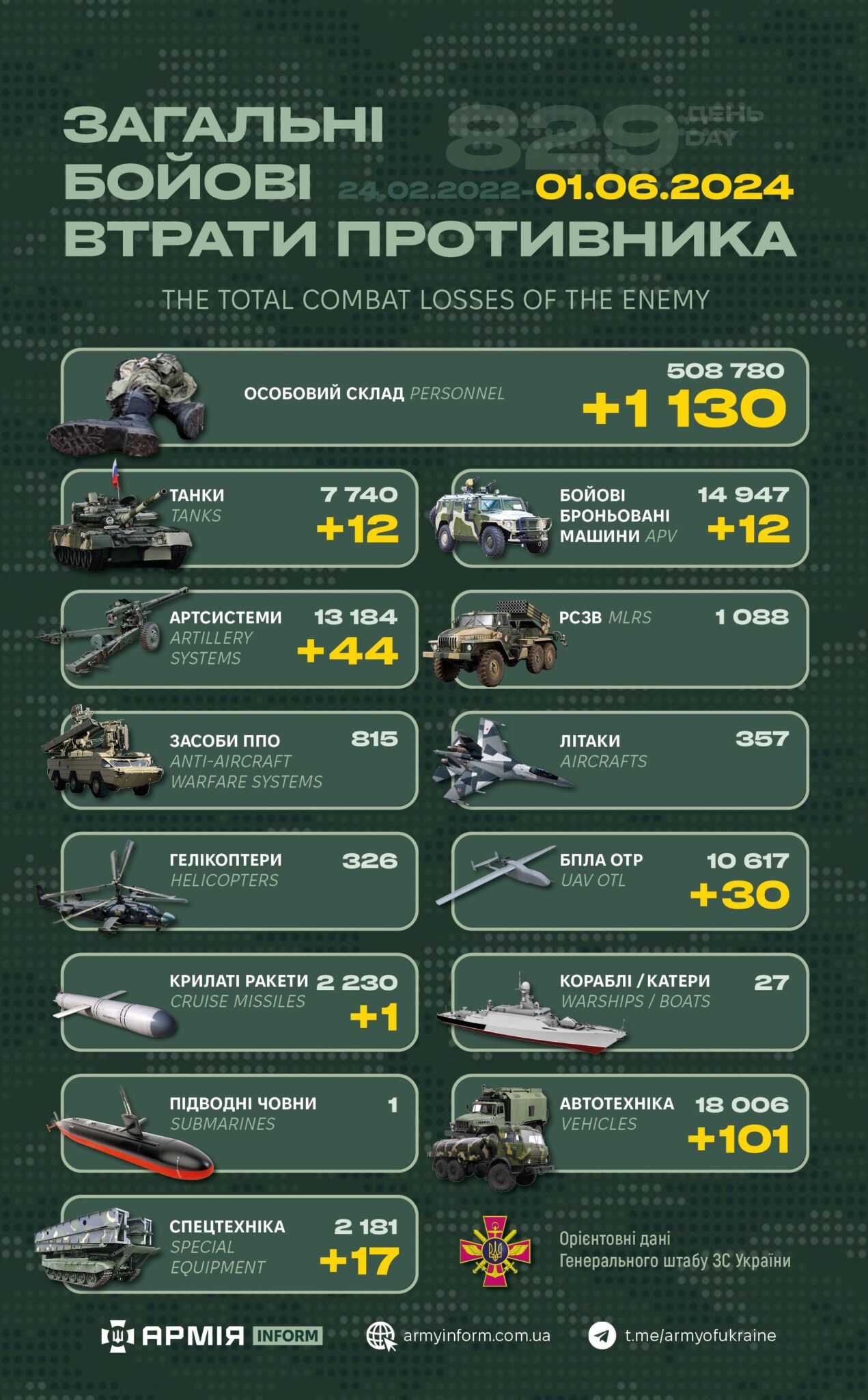 Генеральний штаб Збройних Сил України оприлюднив загальні бойові втрати противника з 24.02.22 по 01.06.24.