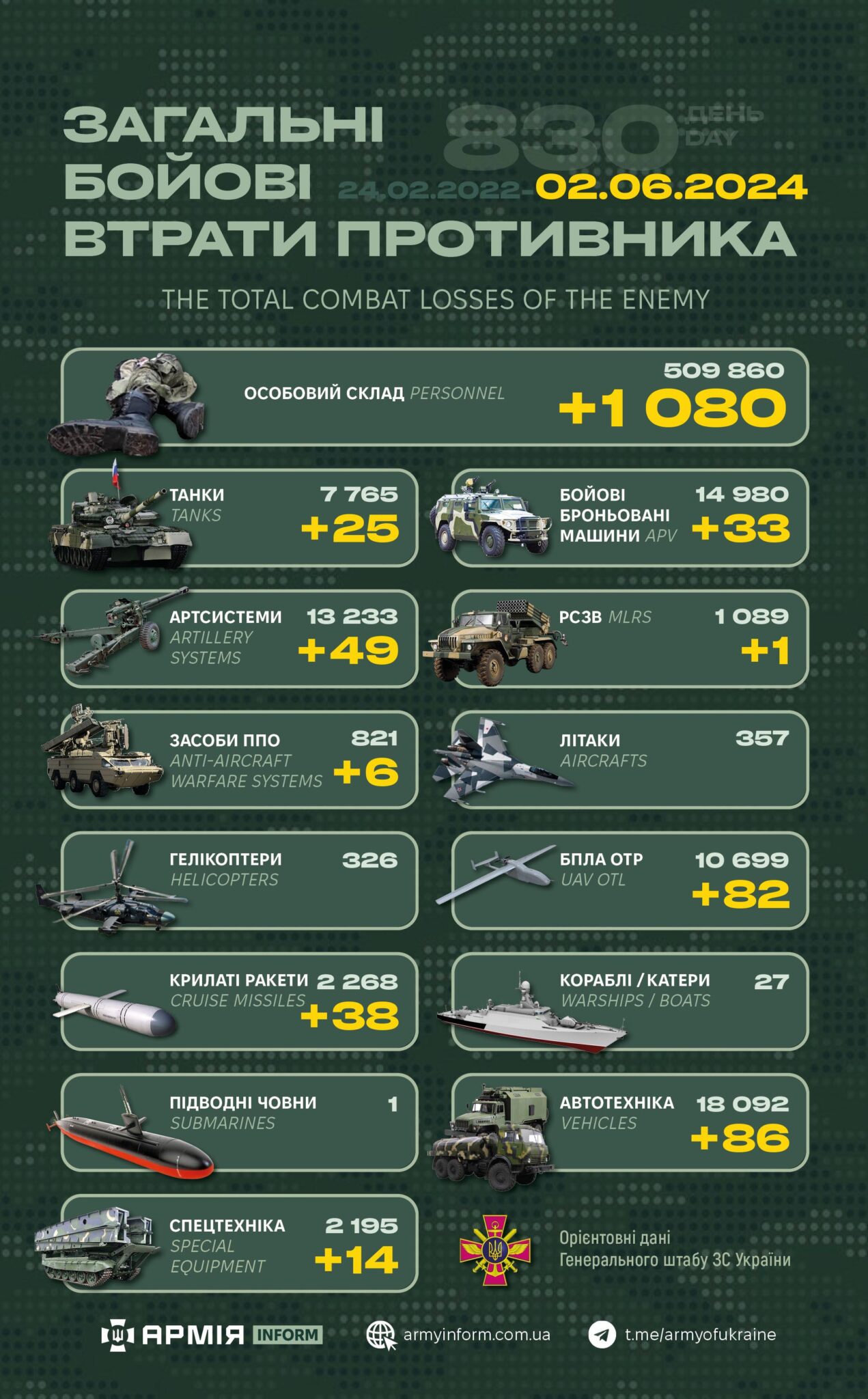 Генеральний штаб ЗСУ оприлюднив загальні бойові втрати противника з 24.02.22 по 02.06.24.