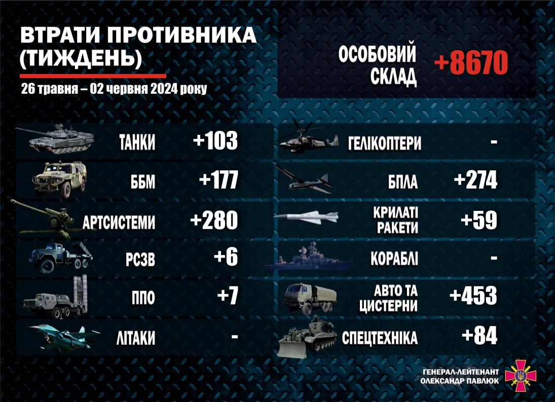За тиждень з 26 травня по 2 червня 2024 року втрати противника склали близько 8670 осіб особового складу та 1443 одиниці озброєння та військової техніки.