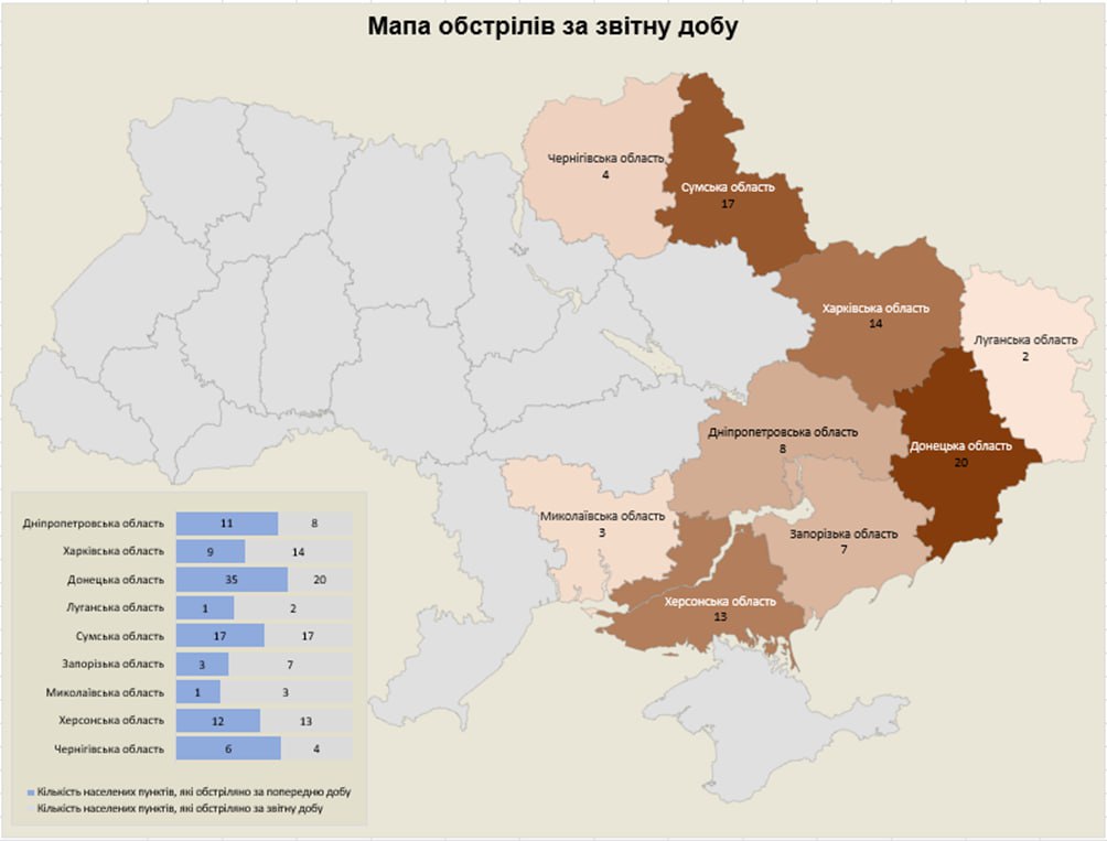 «Загалом з різних видів озброєння — міномети, танки, ствольна артилерія, РСЗВ, ЗРК, ОТРК, БПЛА та тактична авіація — були атаковані 88 населених пунктів та 106 об’єктів інфраструктури», — йдеться в повідомленні.