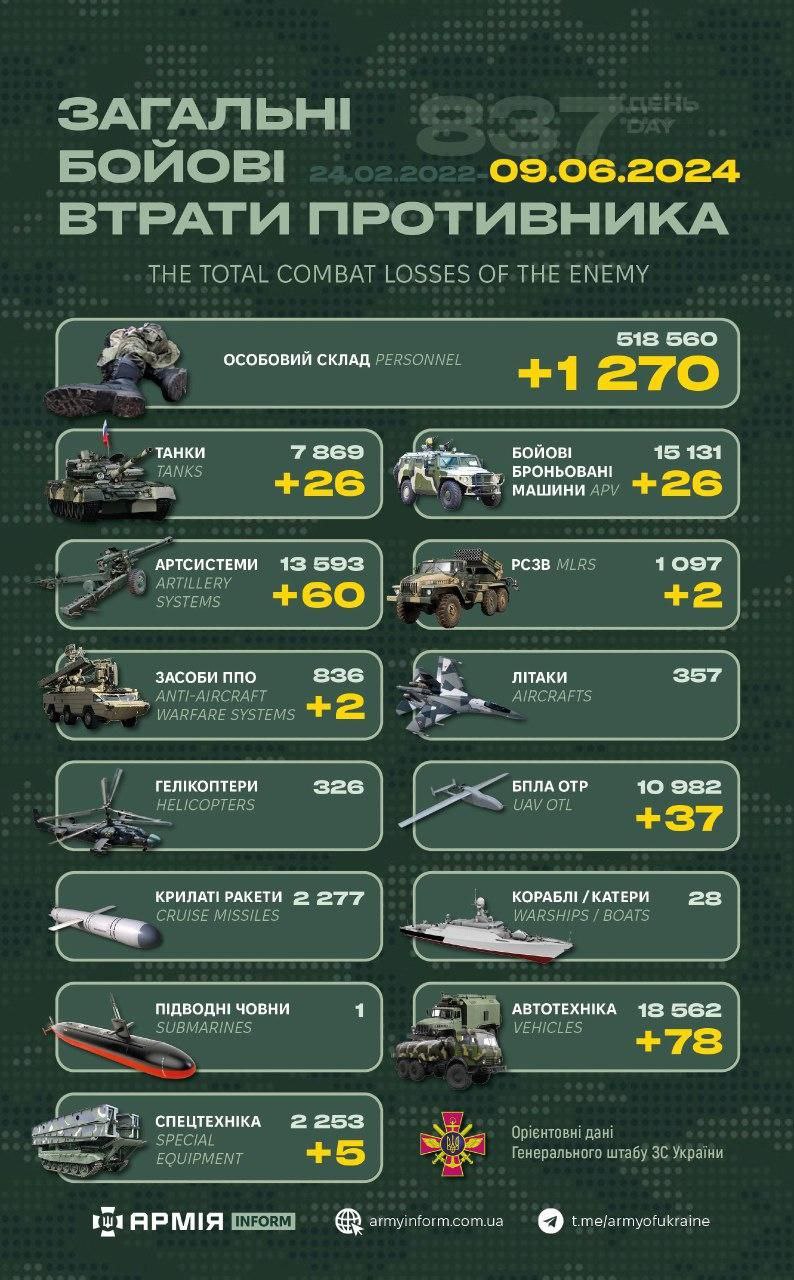 Загальні бойові втрати противника оновив вранці 9 червня Генеральний штаб ЗСУ.
