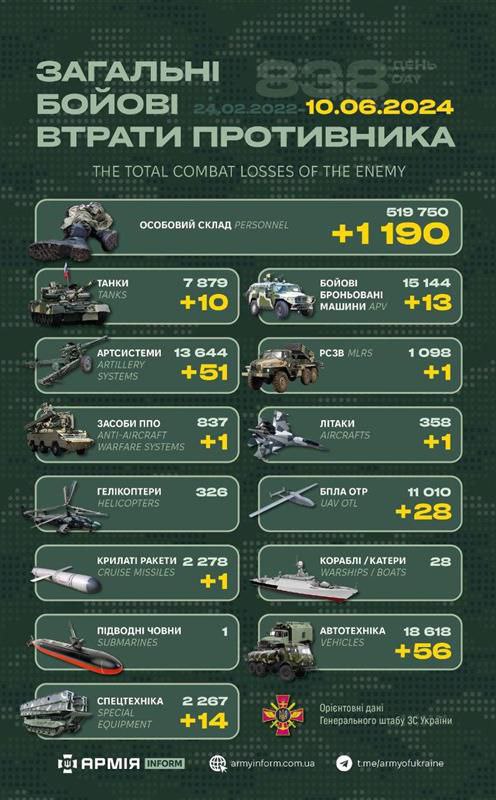 Генеральний штаб ЗСУ надав загальні бойові втрати противника з 24.02.22 по 10.06.24.