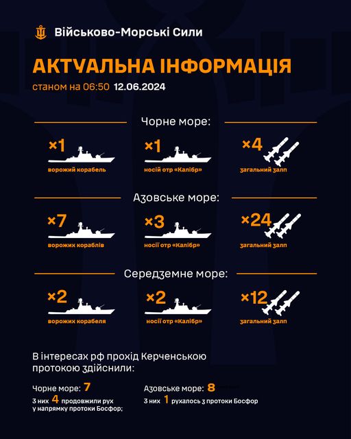 Військово-Морські Сили ЗСУ доповіли про перебування у Чорному та Азовському морях станом на 06:50 12.06.2024 чотирьох російських носіїв крилатих ракет «калібр».