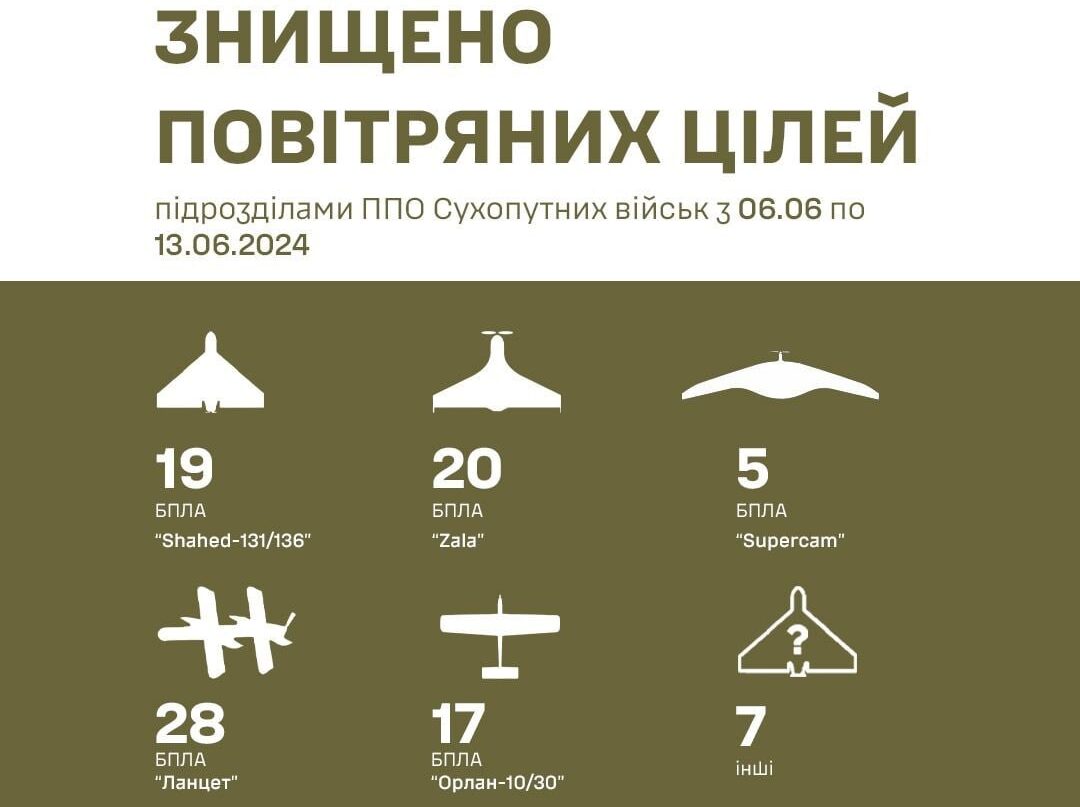 З 6 по 13 червня підрозділи протиповітряної оборони Сухопутних військ знищили 96 засобів повітряної розвідки та нападу противника.